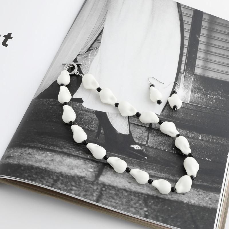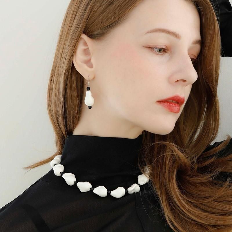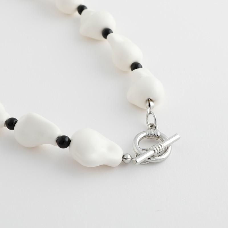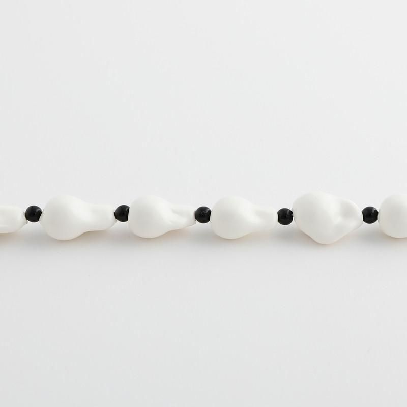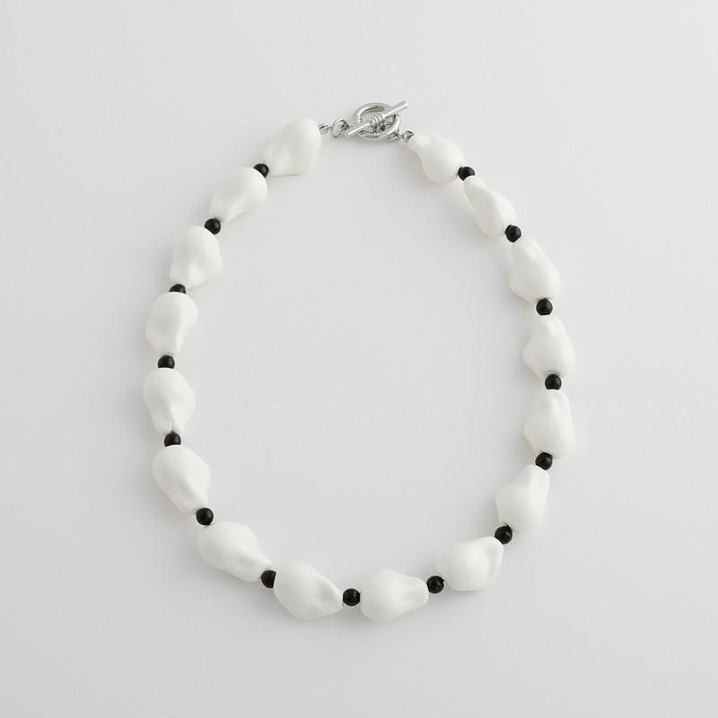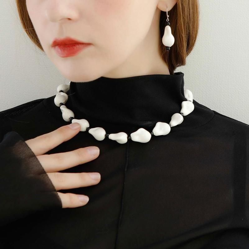 ひとつひとつ形の異なる大粒ビーズが連なるデザインは、存在感がありながらもスタイルに馴染む、アートピースのようなアクセサリーです。