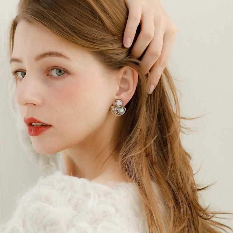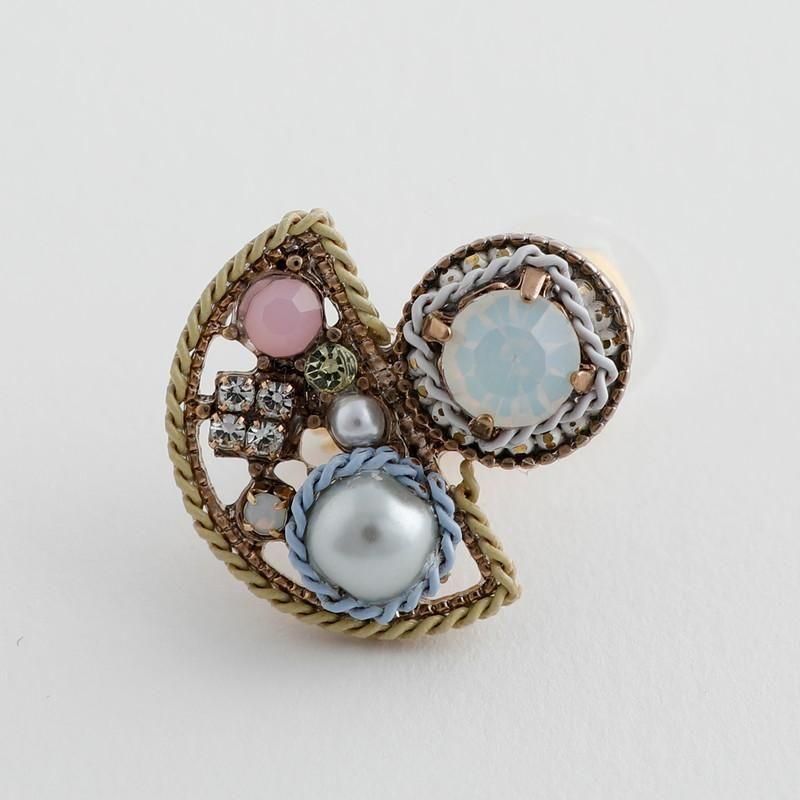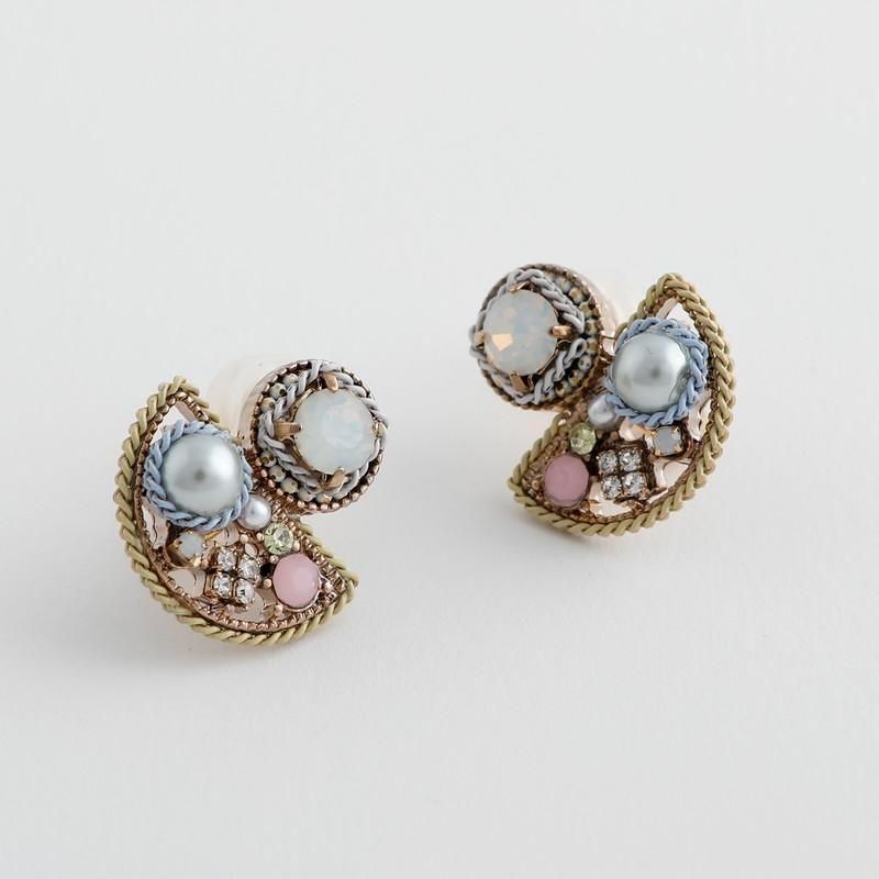 ビーズ、ガラスストーン、アクリルパールを組み合わせ、オーロラのように角度によって表情を変えるイヤリングです。